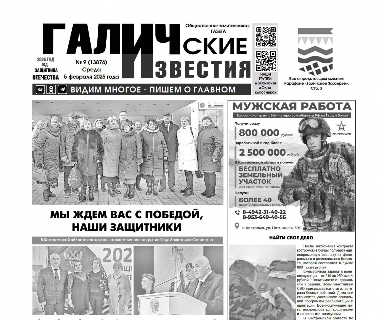 5 февраля выйдет очередной номер (№ 9) газеты «Галичские известия». Что интересного? Читайте в этом номере газеты: Все о предстоящем лыжном марафоне «Галичское Заозерье» Стр.3