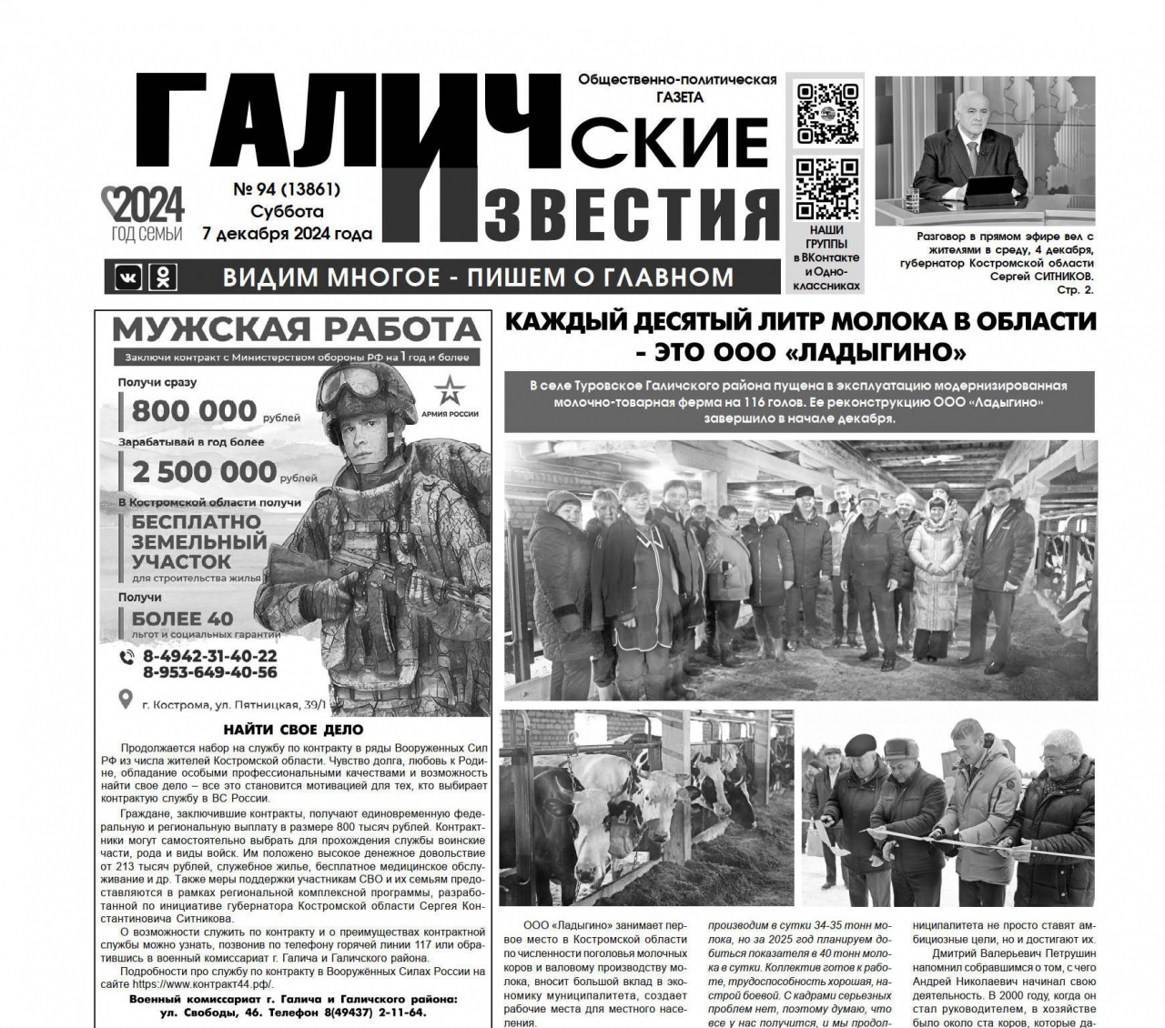 7 декабря выйдет очередной номер (№94) газеты "Галичские известия". Что интересного? Читайте в этом номере газеты: Разговор в прямом эфире вел с жителями в среду, 4 декабря, губернатор Костромской области Сергей СИТНИКОВ.