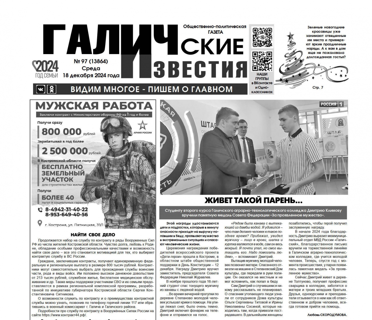 стр. 1 – Студенту второго курса Галичского аграрно-технологического колледжа Дмитрию Климову вручили памятную медаль Совета Федерации «За проявленное мужество».
