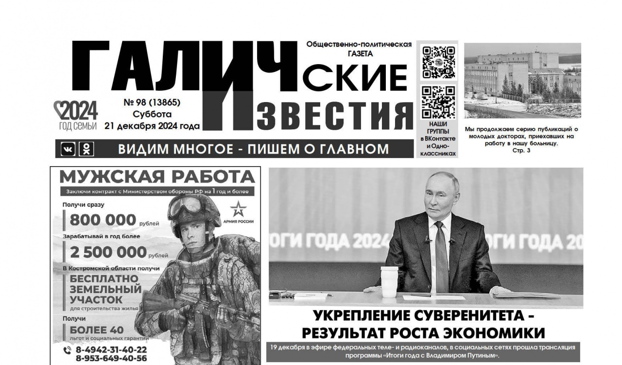 21 декабря выйдет очередной номер (№98) газеты "Галичские известия". Что интересного? Читайте в этом номере газеты: Мы продолжаем серию публикаций о молодых докторах, приехавших на работу в нашу больницу. 3 стр.