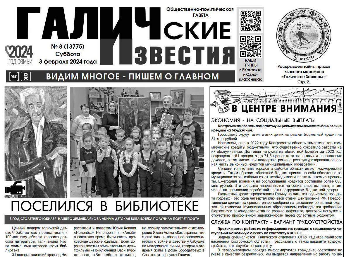 3 февраля вышел очередной в 2024 году номер (№8) газеты "Галичские известия". Что интересного? Читайте в этом номере газеты: