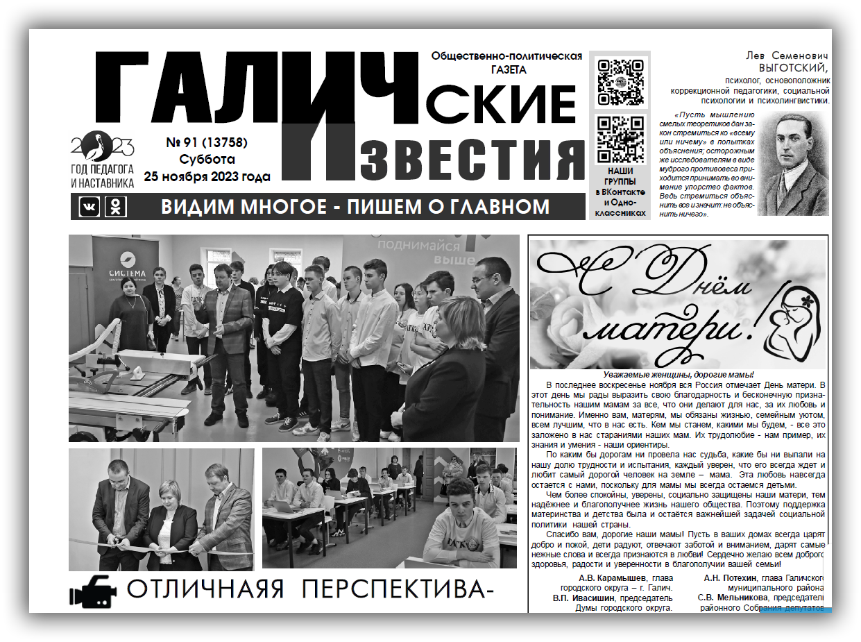 С 1 ноября редакция газеты «Галичские известия» предлагает в дополнение к традиционному новый вид подписки: в виде файла в формате PDF, который можно прочитать на любом компьютере, планшете или смартфоне. Файл и по оформлению, и по содержанию в точности соответствует бумажной версии газеты.