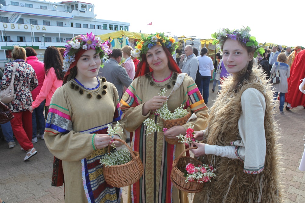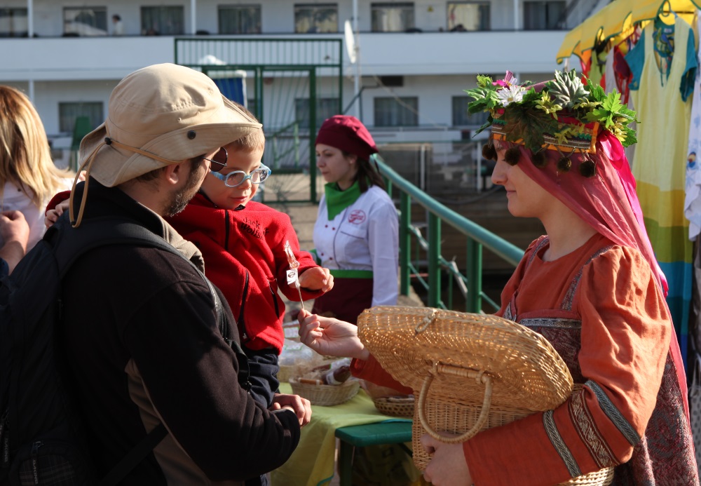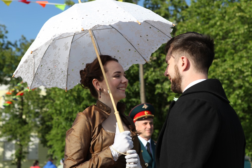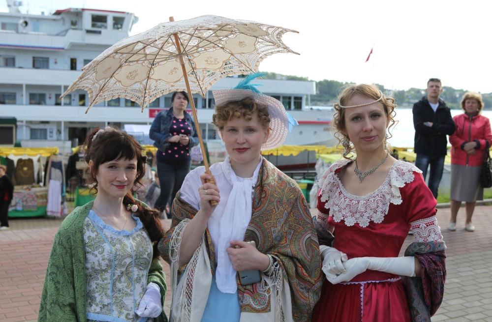 Неповторимый колорит создали костромичи разных эпох - областные артисты в костюмах разных веков прогуливались по набережной прямо среди гостей, с удовольствием фотографировались с ними и угощали костромскими разносолами.