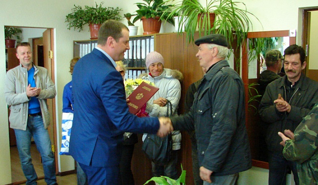 Депутат Костромской областной Думы Василий Борисович Комиссаров вручил Почетную грамоту областной Думы Юрию Геннадьевичу Голубеву, водителю мусоровоза ООО «Полигон».