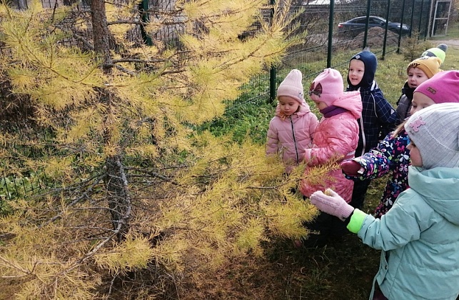 Сегодня воспитанники группы "Радуга" во время экскурсии познакомились с хвойными растениями:сосной, ёлкой и лиственницей, узнали чем они отличаются друг от друга, а также наблюдали сезонные изменения, которые происходят с ними осенью.