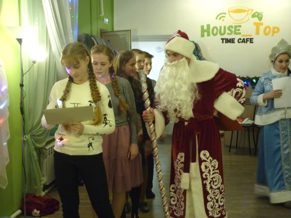 А вот девчонки и мальчишки 7в класса лицея №3 вместе со своим классным руководителем Еленой Сергеевной Быковой встречали Новый год с друзьями в кафе «HouseTop». Снегурочка, Дед Мороз и гостеприимная Пиратка были очень рады нашей шумной компании. Какие только конкурсы и задания ребята не выполняли: на смекалку, на быстроту движений, на внимательность и ловкость, на точность выполнения, на импровизацию! Улыбки и хорошее настроение, общение, сладости и подарки друг другу, зажигательные танцы с Дедом Морозом и Снегурочкой – всё это было в этот вечер!
