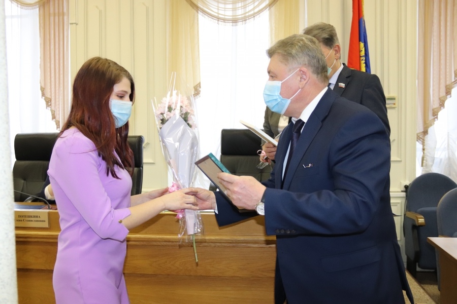 В Татьянин день студентка специальности «коммерция» Вероника Негоица получила из рук председателя Костромской областной Думы Алексея Анохина свидетельство о награждении думской стипендией.