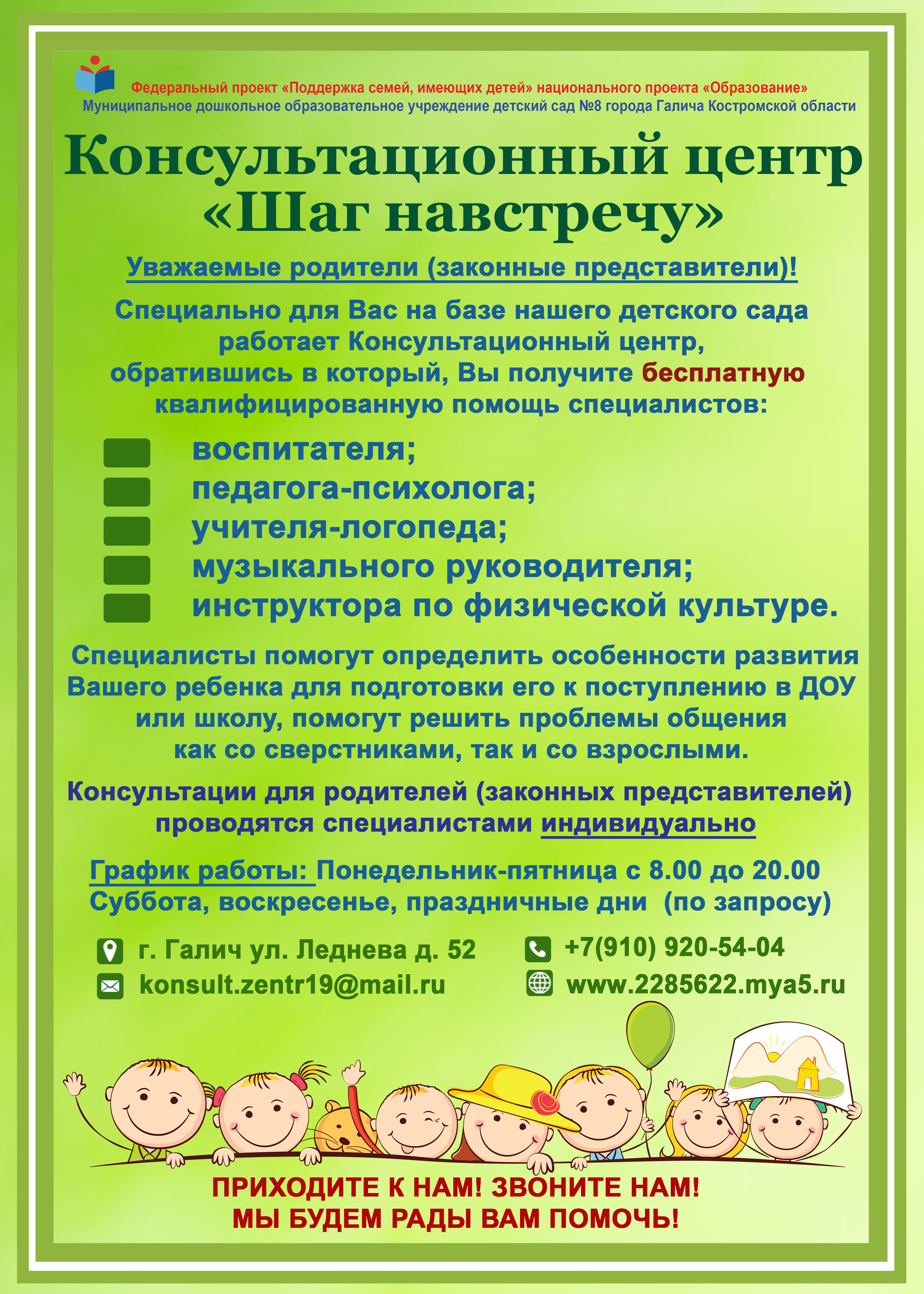 - Наш консультационный центр «Шаг навстречу» функционирует в качестве необособленного структурного подразделения на базе детского сада № 8 с 2020 года. Решение о его создании не было спонтанным, вопрос, а точнее спрос, назревал давно. Каждый год растет количество обращений за дополнительной помощью к специалистам центра. Это побуждает нас к осваиванию и созданию новых проектов, к поиску путей решения возникающих проблем. Специалисты, работающие в центре, способны помочь родителям грамотно оценить развитие ребёнка с учётом возрастных особенностей и норм.