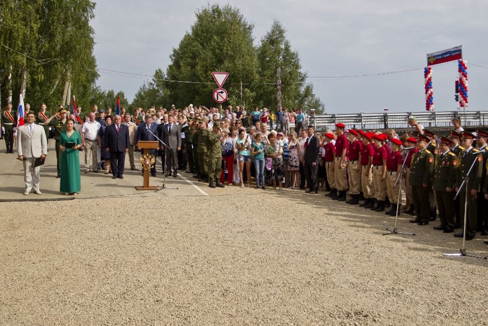 Едва вернувшись домой, новоиспеченные юнармейцы получили приглашение на торжественную церемонию открытия моста через Унжу, который этим летом возвели в Макарьевском районе российские военные - военнослужащие бригады материально-технического обеспечения Западного военного округа. Тут же забыв про усталость, собрались и поехали едва не через пол-области. И дальняя дорога стоила того: на торжественной, если не сказать величественной, церемонии открытия переправы, которую своим выступлением украсил Дважды Краснознаменный Академический ансамбль песни и пляски Российской Армии имени А.В.Александрова, среди звездных погон, защитных кителей, блестящих кокард и строгих, уверенных офицерских взглядов они стояли как равные – юный отряд доблестной армии великой страны.