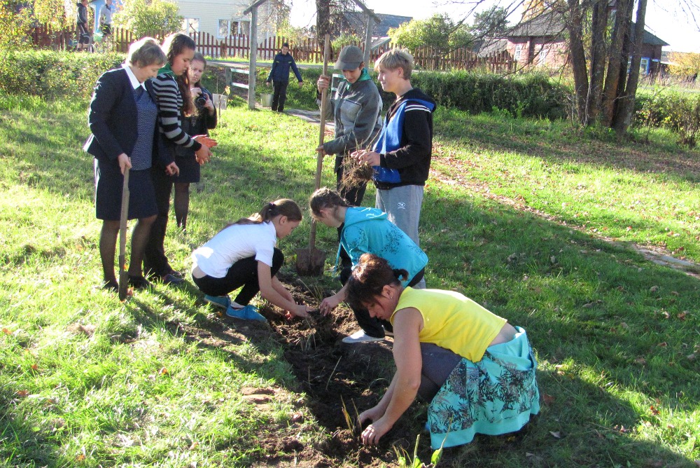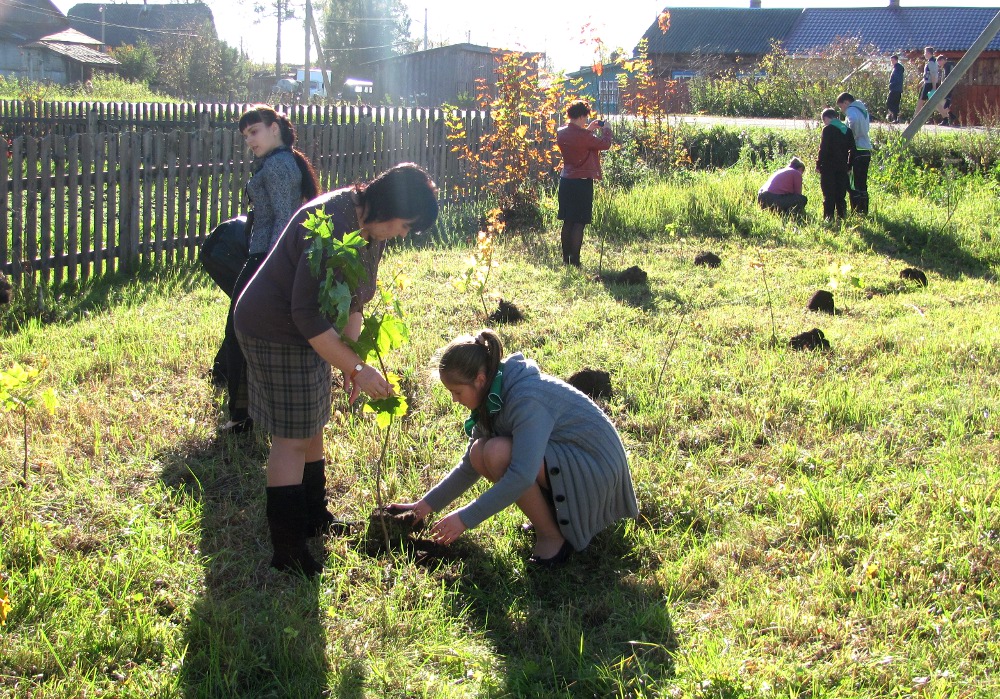 Для каждого дерева было подготовлено место, выкопана лунка. Мальчишки вырезали лопатами кубики земли с дерном, другие носили ведрами воду для поливки. Девочки сажали флоксы. Быстро и дружно зеленая лужайка перед Домом культуры обрела иной вид.