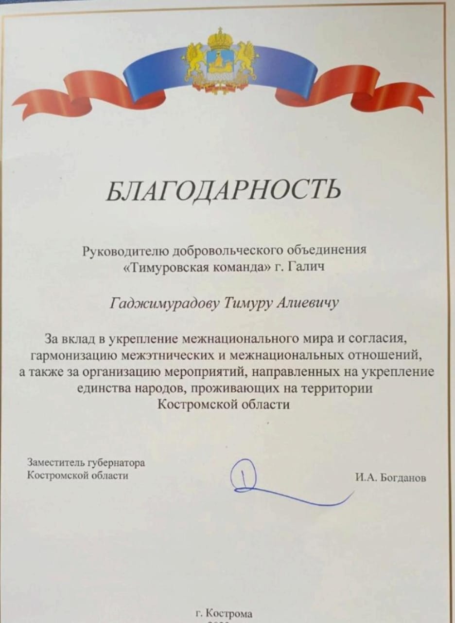 Председатель мусульманского религиозного общества г. Галич выражает благодарность за поддержку и помощь в проведении турнира по мини-футболу имаму Костромской соборной мечети Арифу Сафиуллину и председателю МРОМ г. Нерехта Костромской области Хуршеду Тиллоеву, КООО " Многонациональная Кострома" Камрану Бабаеву, Ибрагимову Касуму руководителю фермерского хозяйства Чухломского района, особенно хочу поблагодарить представителя Республики Дагестан по Костромской области Фейзуллаха Насруллаева и Тимура Абдурахманова за то что организовали ФК " Нур" и предоставили спортзал для проведения турнира по мини футболу и помещение( кафе ) для угощения всех участников и гостей.