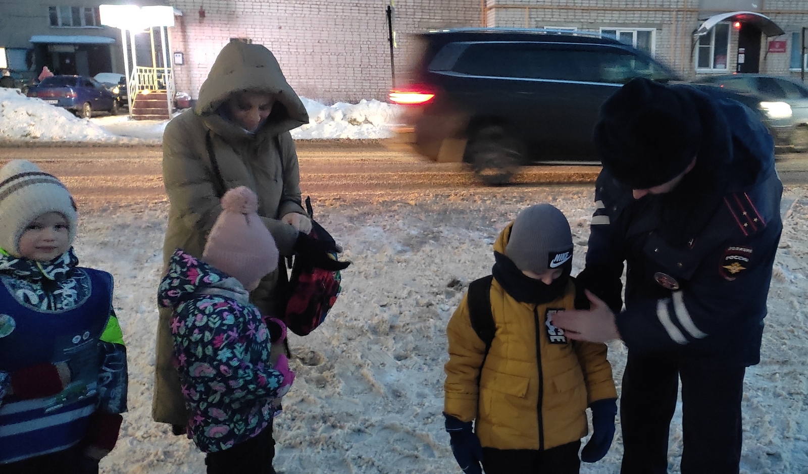 Галичской Госавтоинспекцией совместно с общественным советом при МО МВД России «Галичский», отрядом ЮПИД и родительским патрулём 11 детского сада в рамках предупреждения детского дорожно-транспортного травматизма проведена акция «Зимняя дорога полна опасностей!».В ходе проведения акции, направленной на профилактику детского дорожно-транспортного травматизма и ДТП с участием пешеходов, организаторы мероприятия акцентировали внимание родителей на использование СВЭ, напомнили основные правила безопасности при переходе дороги, соблюдения правил перевозки детей. Каждый взрослый участник мероприятия получил информационную памятку, а детям на верхнею одежду совместно с родителями и Юпидовцами, были прикреплены «Обереги в дорогу» - световозвращающий элемент, который обезопасят юных пешеходов.