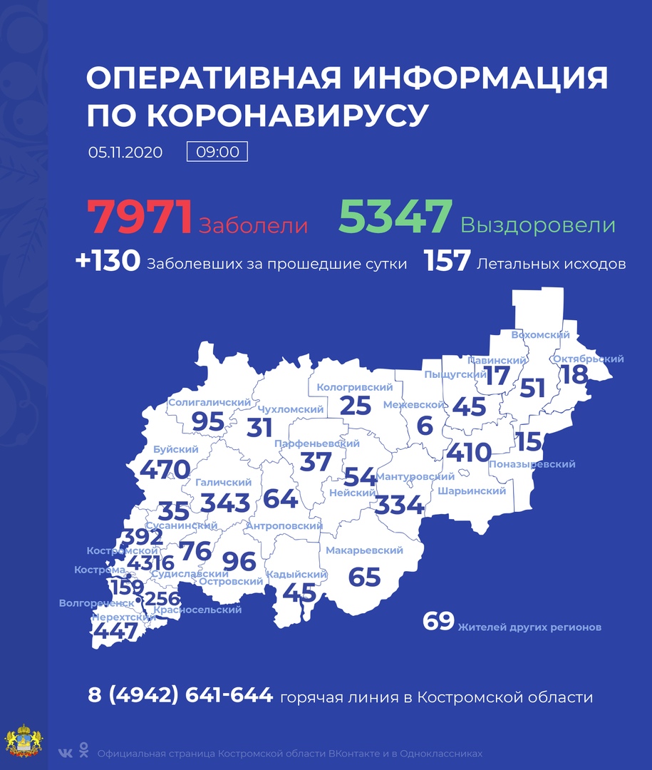 В целом по области за минувшие сутки среды, 4 ноября, COVID-19 диагностирован у 130 человек. За сутки коронавирус подтвердился у 64 костромичей, а также 17 жителей Галича и 16 - Костромского района. По пять заболевших прибавилось в Шарье и Красном-на-Волге. По четыре человека инфицированы в Судиславском и Островском районах, по трое - в Буе и Вохомском районе. По два случая COVID-19 диагностировано в Макарьеве и Чухломском районе. Еще по одному заболевшему прибавилось в Нерехте, Сусанино, Парфеньевском и Нейском районах. Среди заболевших также один житель не Костромской области. По всем случаям заболевания специалисты Роспотребнадзора проводят эпидемиологические расследования. Всем заболевшим оказывается необходимая медицинская помощь. Врачи вылечили - 50 ранее заболевших. Несмотря на все предупредительные меры, врачам не удалось спасти трех мужчин – 45, 62 и 80 лет, имевших тяжелые хронические заболевания. С начала пандемии в Костромской области коронавирусной инфекцией заболели 7971 человек. Врачи вылечили 5347 человек, около 70% от общего числа заболевших. В стационарах находятся 303 пациента, 2164 заболевших проходят лечение амбулаторно. Администрация Костромской области напоминает о необходимости использования в общественных местах средств защиты органов дыхания и соблюдения социальной дистанции. Гражданам старшего возраста необходимо максимально ограничить посещение общественных мест. Берегите себя и своих близких. По информации пресс-службы губернатора Костромской области